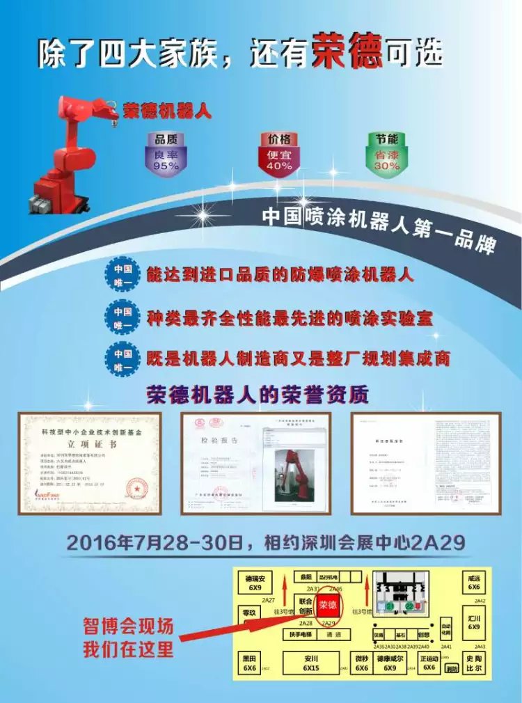 雖然在南海問題愈演愈烈的當(dāng)下,支持民族品牌已是大勢(shì)所趨,但榮德機(jī)器人不打感情牌,我們打技術(shù)牌、實(shí)力牌,如果您有興趣參觀過榮德的展位2A29,也許您會(huì)發(fā)現(xiàn):除了四大家族,榮德噴涂機(jī)器人也是一個(gè)非常不錯(cuò)的選擇!多謝指教!