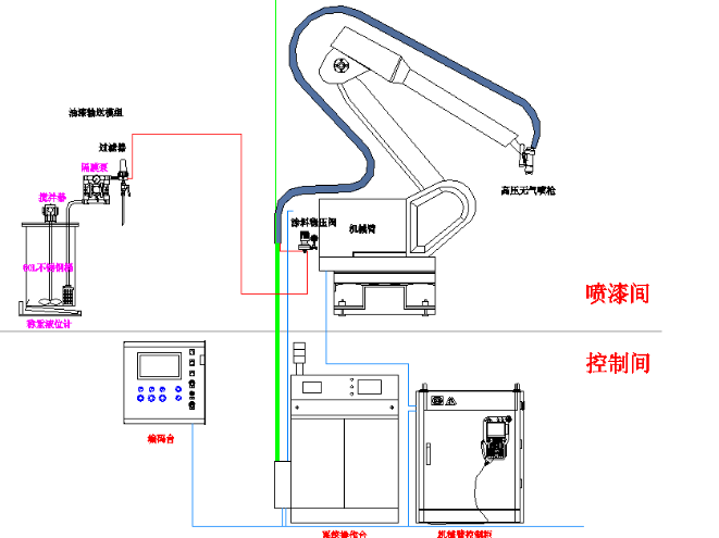 噴漆工位采用機(jī)械臂自動噴涂加人工補(bǔ)漆,其中人工補(bǔ)漆面積不能大于5%,應(yīng)保證線上能同時自動噴底漆和自動噴面漆,不允許采用更換油漆管道分不同時段噴底漆或面漆。自動噴涂工位主要配置由噴涂機(jī)器人(防爆型,且具有示教功能)、供漆系統(tǒng)(高壓無氣供漆泵及管路,油漆調(diào)漆桶,儲漆桶,氣動攪拌器等)、高壓無氣自動噴槍、人工補(bǔ)漆系統(tǒng)及控制系統(tǒng)等組成。