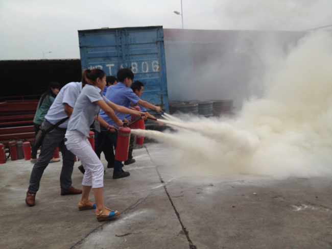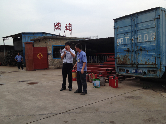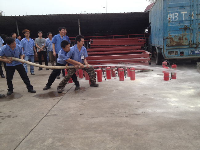 2、消防知識(shí)培訓(xùn)。等大家集中到了廠外安全區(qū)域后,由義務(wù)消防隊(duì)人員對(duì)全員進(jìn)行滅火器材的使用方法。主要是干粉滅火器和消防栓的使用。安全主任謝京亮邊講解邊模擬使用傳授給所有員工滅火器的使用步驟:搖一搖、拔下插銷、瞄準(zhǔn)火焰根部、壓下把手、來回掃射。